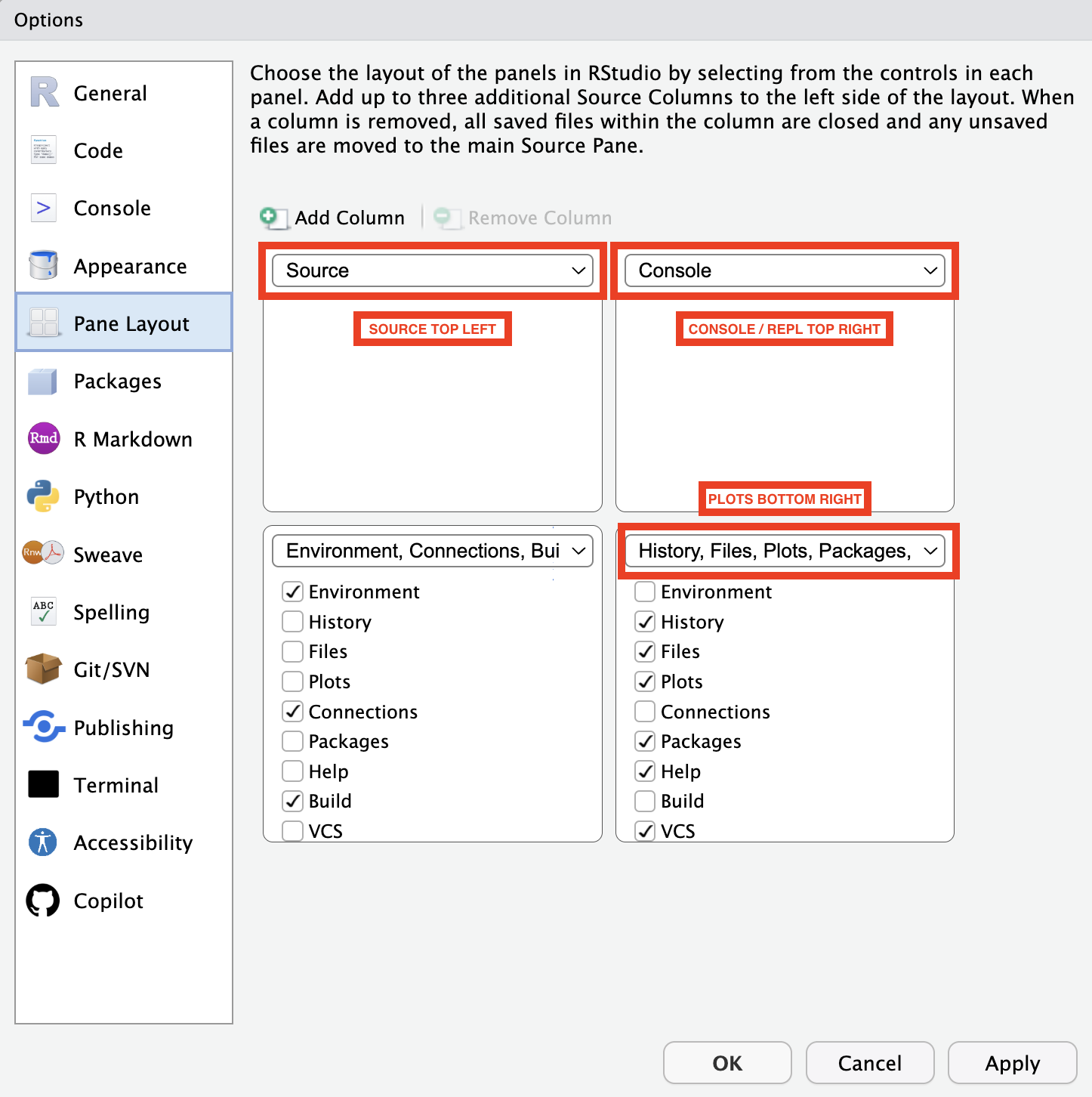 - “Cheatsheets and handouts” section in the left panel contains a single-page version of these slides and RStudio and base R cheatsheets for your reference