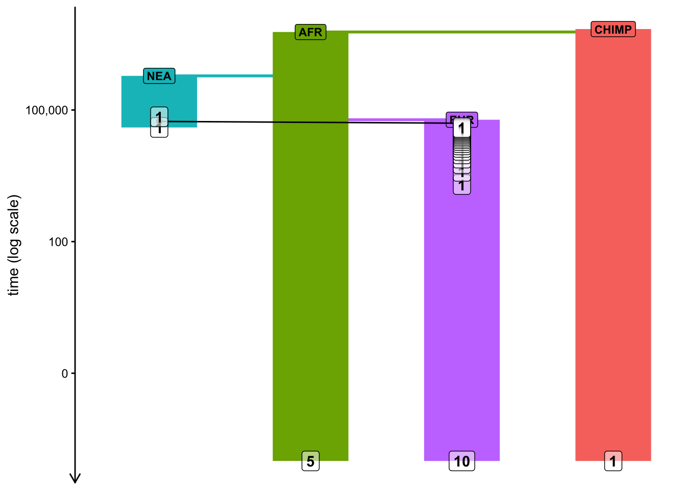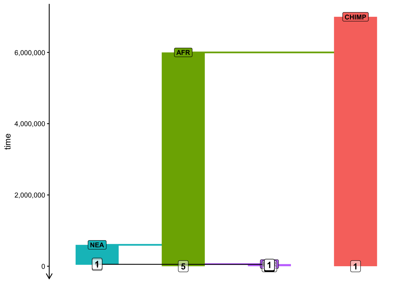 Note: You easily program the model so that different ancestral populations are represented by separate population() commands (i.e., your model would start with a population called “human_chimp_ancestor” from which a “CHIMP” and “hominin_ancestor” populations would split at 6 Mya, etc.) but generally this is too annoying to do and requires too much code. Feel free to write the model so that “CHIMP” is the first population, then “AFR” population splits from it at 6 Mya, etc. Although it probably isn’t the most accurate way to describe the real evolutionary history, it simplifies the coding significantly.