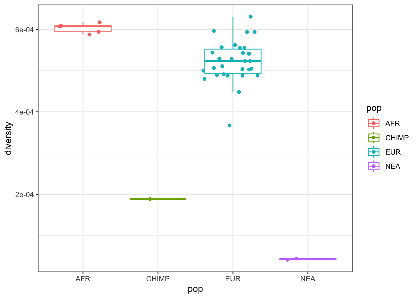 After you’ve computed nucleotide diversity per-population, compute it for each individual separately using the same function ts_diversity() (which, in this setting, gives you effectively the heterozygosity for each individual). If you are familiar with plotting in R, visualize the individual-based heterozygosities across all populations.
