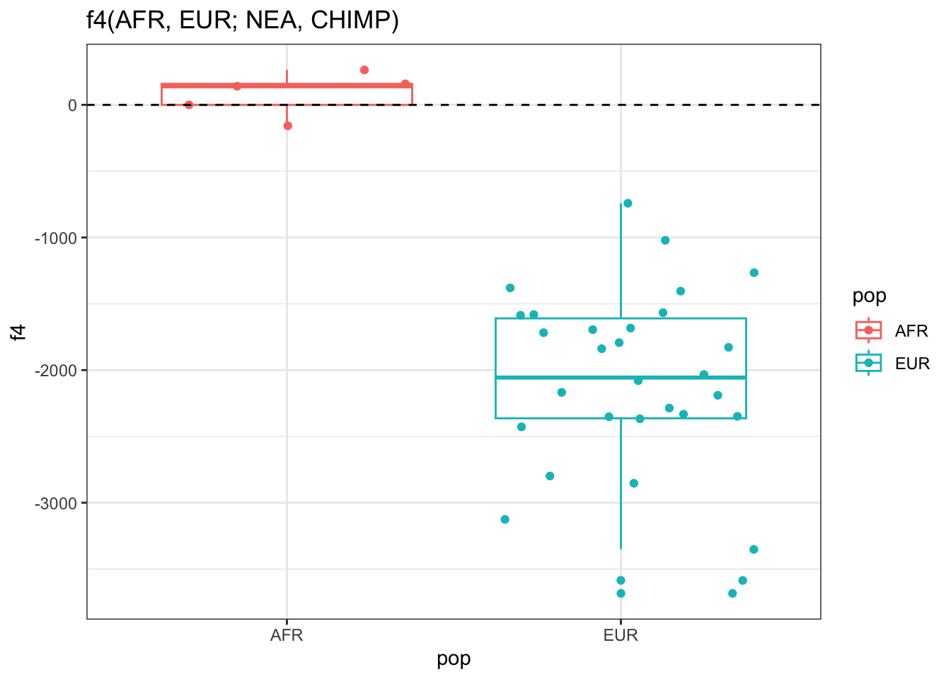 The first \(f_4\) statistic above is not expected to give values “too different” from 0 (even in case of Neanderthal introgression into Europeans) because we don’t expect two African individuals to differ “significantly” in terms of how much alleles they share with a Neanderthal (because their ancestors never met Neanderthals!). The other should — if there was a Neanderthal introgression into Europeans some time in their history — be “significantly negative”.