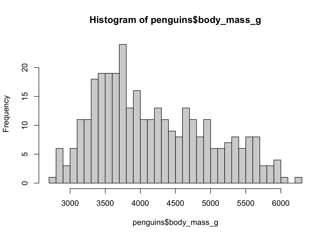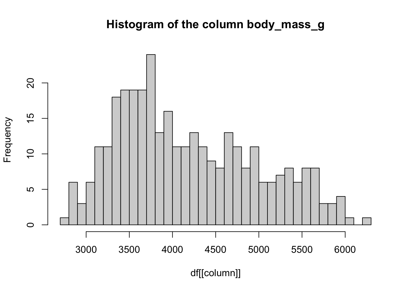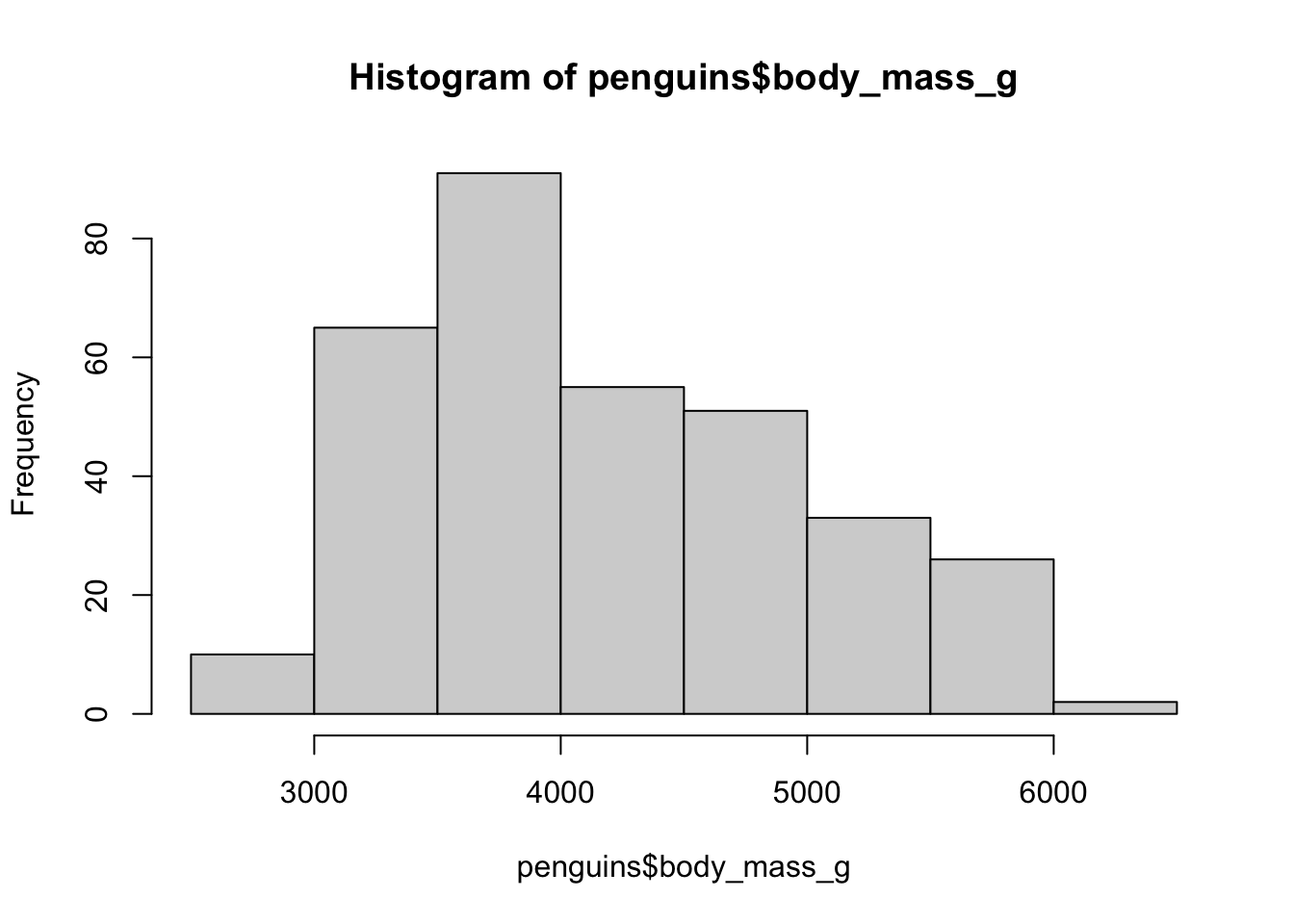 In the penguin section above, you used hist(penguins$body_mass) to plot a histogram of the penguins’ body mass. Write a custom function penguin_hist() which will accept two arguments: 1. the name of the column in the penguins data frame, and 2. the number of histogram breakpoints to use as the breaks = arguments in a hist(<vector>, breaks = ...) call.