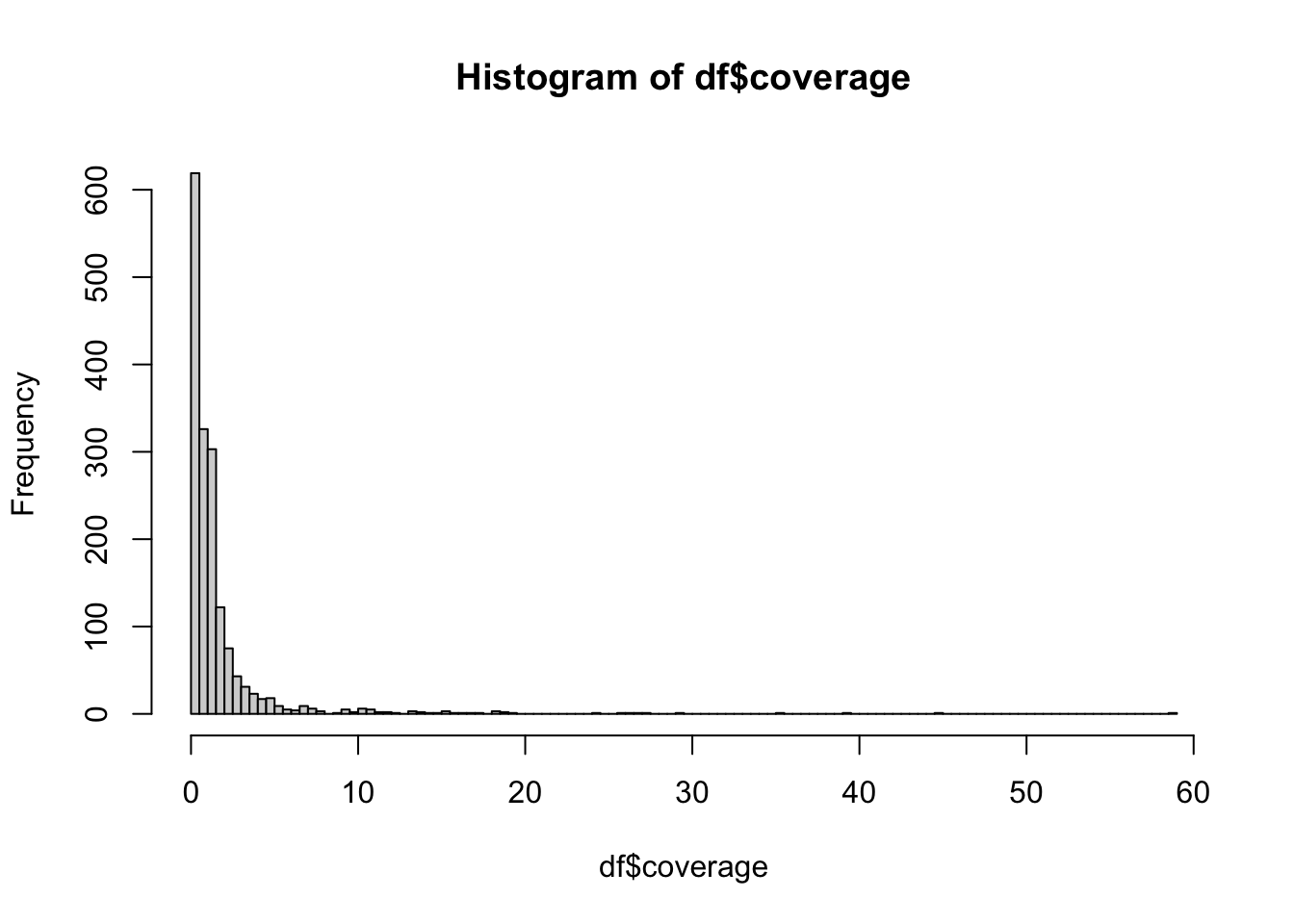 What’s the distribution of coverage of the samples (coverage column)? Compute the summary() function on the coverage column. Finally, use the hist() function to visualize this information to get a rough idea about the data.