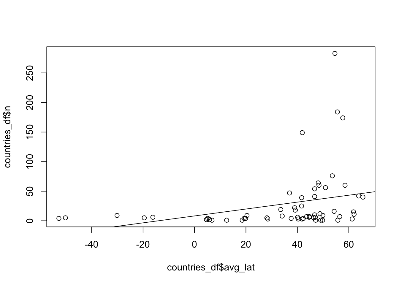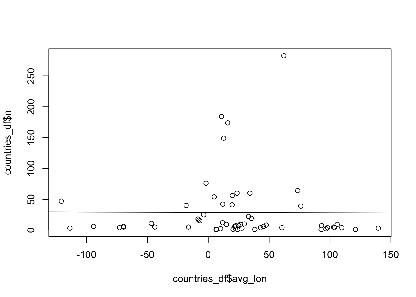 Hint: If you’re not familiar with this, look up the linear model function ?lm or perhaps this tutorial to see how you can build a linear regression between a response variable (like our count n) and an explanatory variable (such as average longitude or latitude of a country), as computed by the group_by() and summarize() combination (the result of which you should save to a new data frame variable, to be used in the lm() function).